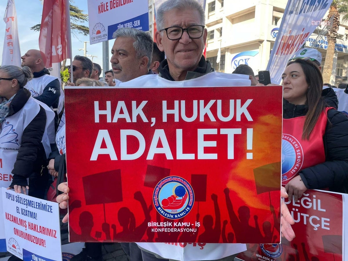 Memurlar, İzmir’de protesto gösterisi düzenledi. Birleşik Kamu-İş İzmir İl Başkanı Barış Düdü, “İnsanca çalışma şartları ve insanlık onuruna yaraşır ücretler istiyoruz. Yoksulluk sınırının üstünde maaş istiyoruz. Gelir vergisinin yüzde 15’e sabitlenmesini istiyoruz. Yılda 4 ikramiye istiyoruz. Kira yardımı istiyoruz” dedi. “Bu iş bırakma eylemimiz bir uyarıdır” ifadelerini kullanan Düdü, “Kamu emekçisi, gasp edilen hakları teslim edilmedikçe üretimden gelen gücünü kullanmayı sürdürecek” diye konuştu.